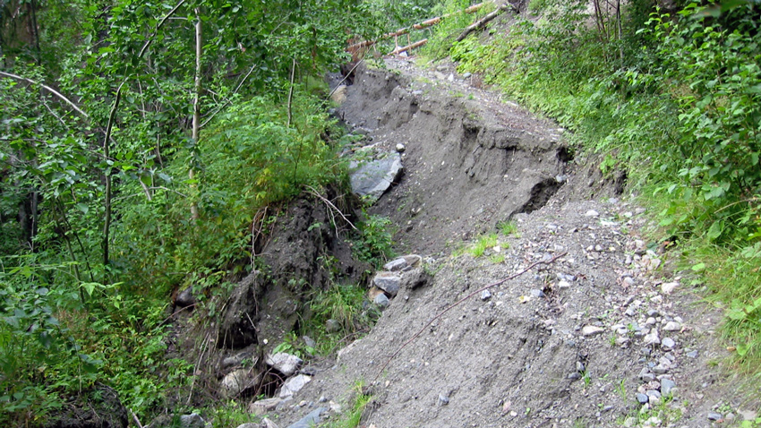 Masseutglidninger ned i grøfta skjer oftest i sterke nedbørsperioder. Spesielt utsatt som følge av overflateavrenning er skråninger med mye finstoff og lav infiltrasjonskapasitet. Reparasjoner er vanskelige så