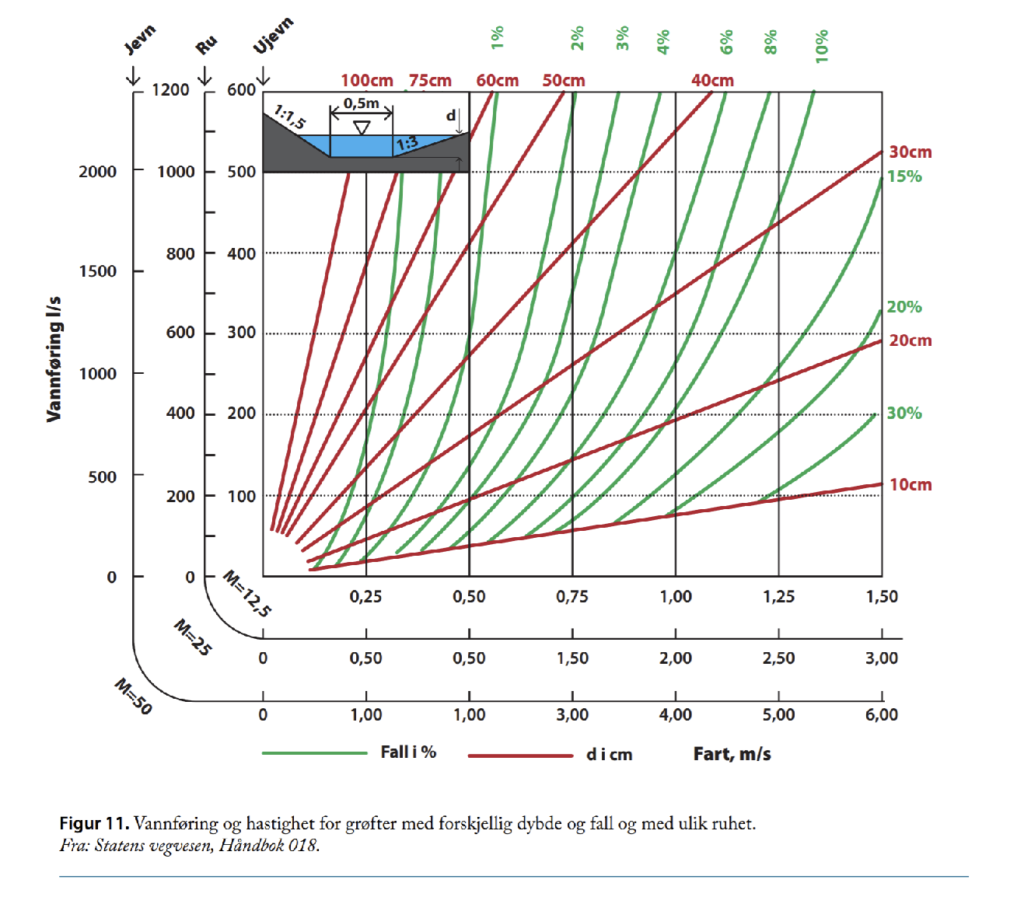 Figur 23 viser den maksimale vannhastigheten som kan tillates ved ulike partikkelstørrelser dersom vi skal unngå erosjon.