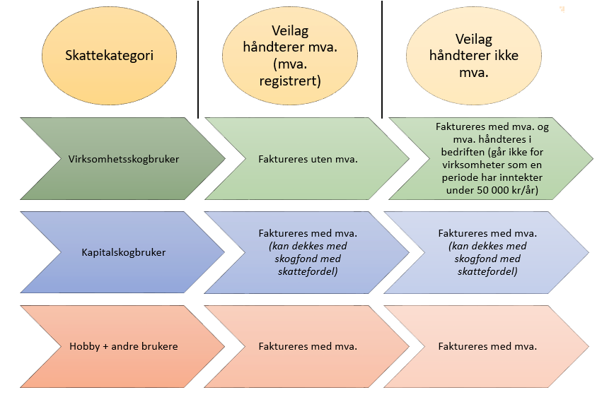 Når mva. håndteres i veilaget, har veilaget ansvaret med å fakturere det enkelte medlem riktig. Veilaget må med andre ord greie ut om hvilken skattekategori de ulike medlemmene tilhører. Alternativt er å ikke håndtere mva. i veilaget, men i stedet kjøre en fakturasplitt + mva. til alle medlemmene.