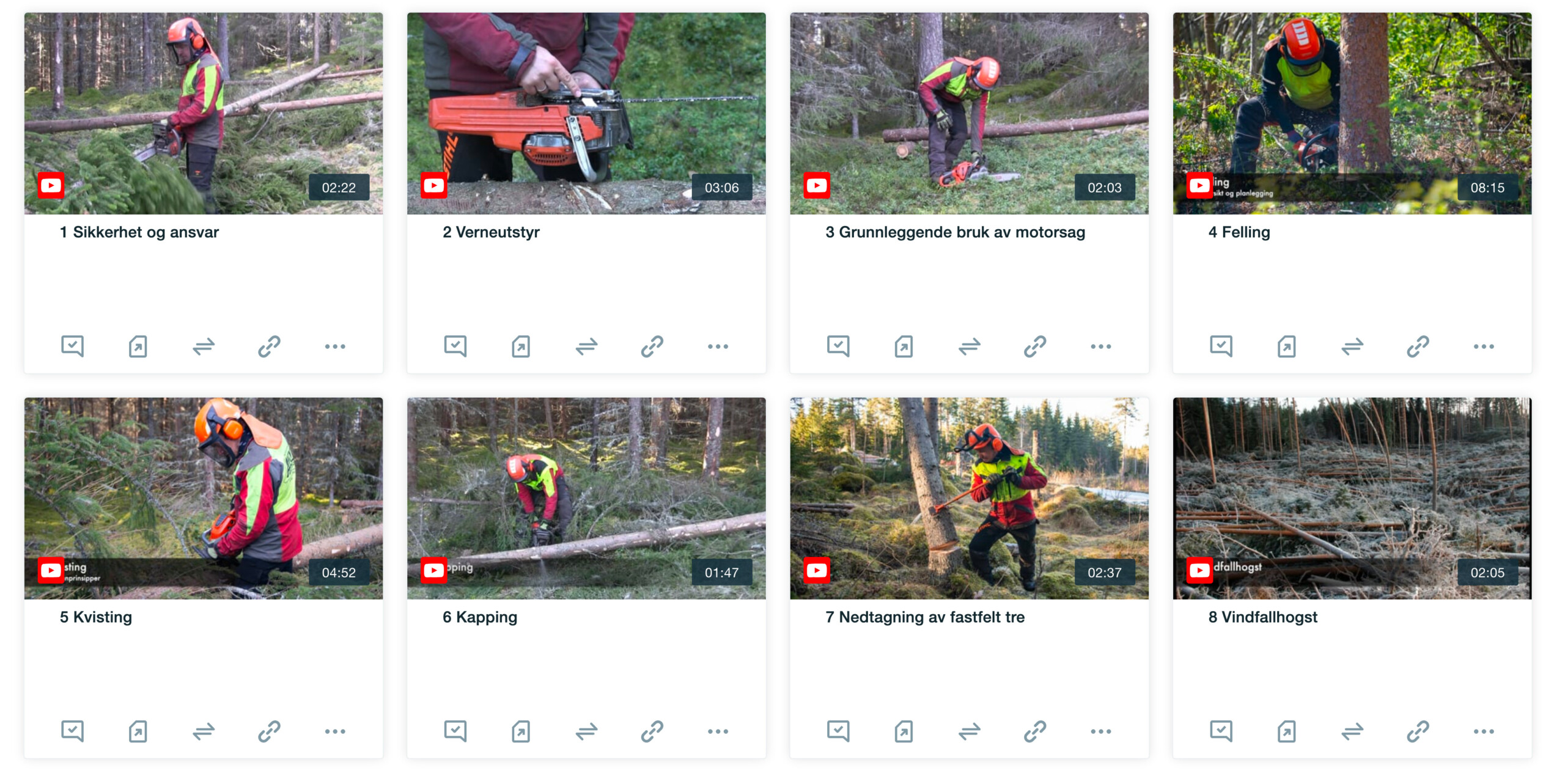 8 filmer om bruk av motorsag sett fra et sikkerhetsperspektiv. Filmklippene skal bidra til færre ulykker og bedre arbeidsmiljø ved å fokusere på de mest utsatte arbeidsoperasjonene ved bruk av motorsag, og hvordan gjennomføre disse på en sikker måte.