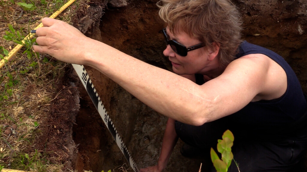 I bakken graves det ned til jordsjiktet fra siste istid. Alle lagene i jorden sier mye om et område og forskeren er begeistret over hva dette kan tydelig merke begeistringen i ansikt og ord over hva dette.